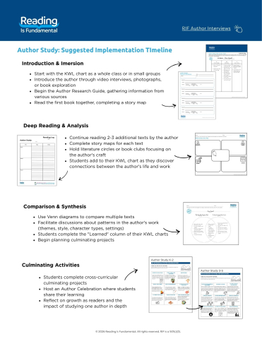 Dive deep into an author's world with RIF's Author Study, a complete K–5 literacy unit that guides students through reading, research, and cross-curricular exploration of a single author's body of work. Packed with educator planning sheets, student worksheets, story maps, KWL charts, Venn diagrams, and differentiated Think-Tac-Toe extension activities for both K–2 and 3–5 learners, this resource makes it easy to build reading fluency, critical thinking, and a lifelong love of books. Which author will your class discover next?